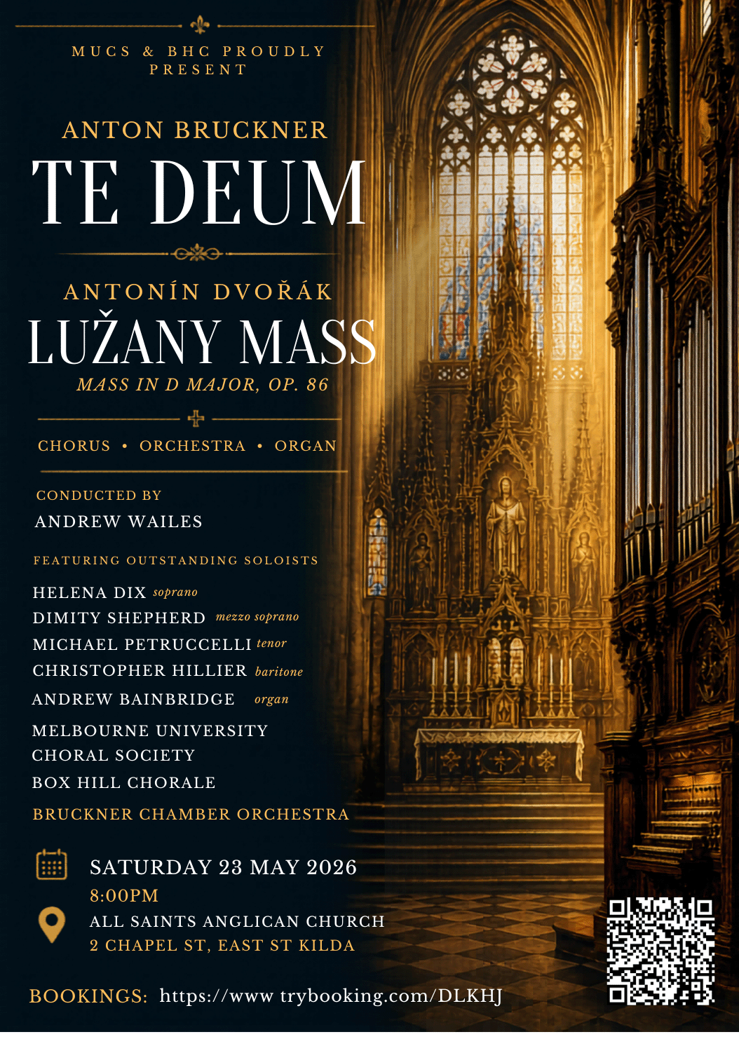 NEXT CONCERT: Bruckner’s Te Deum and Dvořák’s “Lužany Mass in D Major” on Saturday 23 May at 8pm